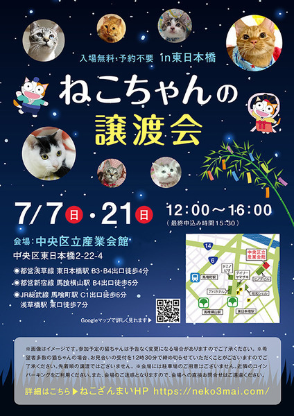 | その他(譲渡条件など) | ★仔猫ご希望の里親様★ 仔猫ちゃんたちは、まだ体がしっかりしていない赤ちゃんです。 下痢だけでも数時間対応ができなかっただけ死に至る事もあります。 その為、月齢に応じたお留守番時間を設けさせていただいております。 また、子猫ちゃん(6ヶ月未満)の里親様には子猫支援金のご協力をお願いいたしております。 ★猫ちゃんとのお見合いは譲渡会で!★ ねこざんまいの猫ちゃんは譲渡会でのお見合いのみとなります。 『この子はいつ譲渡会に参加するの?』『譲渡会場の場所はどこ?』など はねこざんまいホームページをご覧ください。 https://neko3mai.com/ ★楽しく猫ちゃんと触れ合って♪★ ねこざんまい譲渡会は、猫ちゃんも里親様も保護主も笑顔で過ごせる譲渡会を目指しています。 これから20年以上、楽しい時も、悲しい時もいつも傍にいてくれる大切な家族になる猫ちゃんです。 会場には沢山の猫ちゃんがいます。 1匹1匹、触れ合って猫ちゃんとお話ししてください。 『初めて猫ちゃんを家族に迎える方』 『先住猫ちゃんのお友達を迎える方』など トライアルの仕方や先住猫ちゃんと仲良くなるコツなど経験豊富な保護主やスタッフにお気軽にご相談ください! 猫を愛し、そして猫に愛されている猫好きスタッフと保護主がアドバイスさせていただきます。 ★里親希望のみなさまへ★ ペットではなく、家族一員としてたっぷり愛情を注いでくださるご家庭をお待ちしております。 恐れ入りますが、 ・学生の方 ・一人暮らし、同棲中の方 ・子猫、若猫希望の60歳以上のみのご家庭 ・脱走防止対策にご協力いただけない方 は原則お断りさせていただいております。 ただし、預かりボランティアさんとして新しい家族が決まるまでの間、猫ちゃんを預かっていただく道もございます。 参加猫ちゃんは、それぞれ保護主(実際に猫ちゃんを自宅に入れ、保護をしている方)が異なります。 詳しい条件なども異なる場合がございますので、会場内で直接保護主とお話ください。 〖共通条件〗 1.終生飼育 2.完全室内飼い 3.脱走防止対策へのご協力 4.避妊去勢手術 5.契約書類へのサイン 6.定期報告 7.医療費等の負担 当日の猫ちゃんを連れて帰ることはできません。後日、保護主が里親様のご自宅までお届け致します。 その為、移動の際の猫ちゃんの負担を月齢などから考慮し、お届け地区を限定させて頂くこともございますのでご了承ください。 |