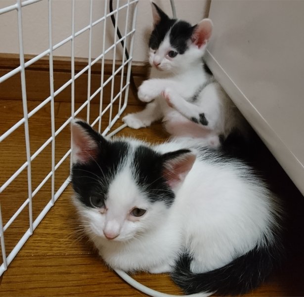 | 特徴(性格など) | 白黒八割れの兄弟です。 もも太郎は何でも興味を示す活発な子。 もも次郎はちょっと控えめな子。 兄弟仲が良くいつも一緒に遊んでいます。 |