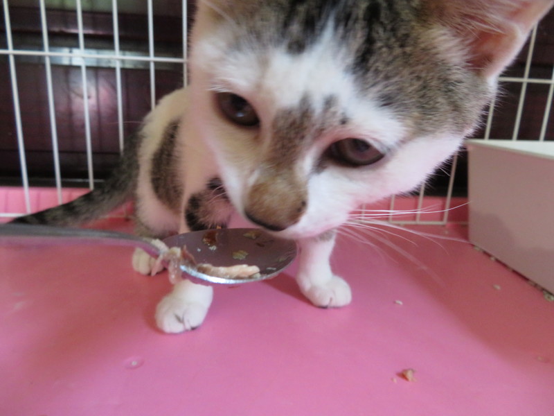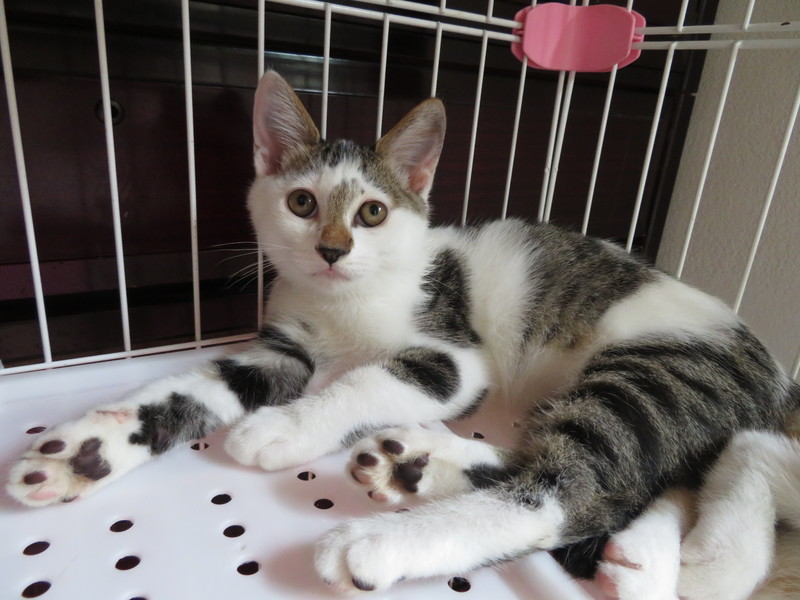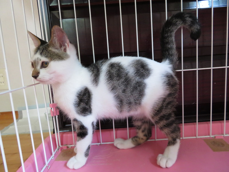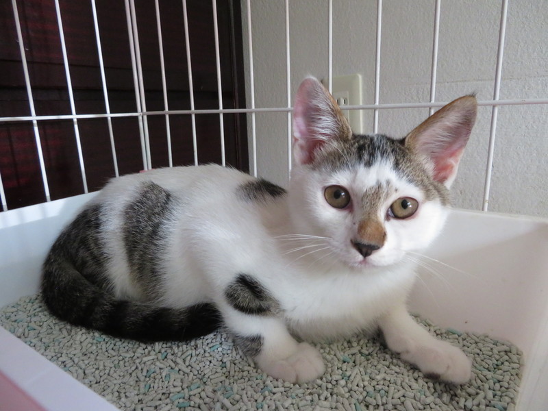| 特徴(性格など) | 賑やかな模様の白キジのコアラくんです。保護して日が浅いため、まだ人間を怖がりますが、だんだんに触らせてくれるようになりました。思わず気持ちよさそうに首を伸ばしちゃって、ハッと我に返る時も。ムフフフ、その調子!家猫修行の成果が少しずつ出始めています。 | ||