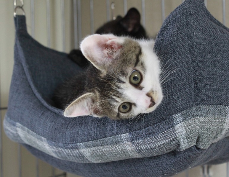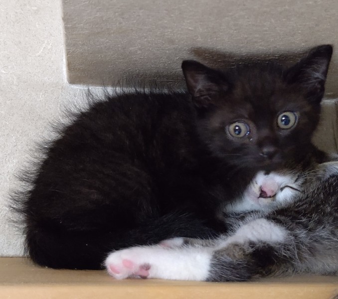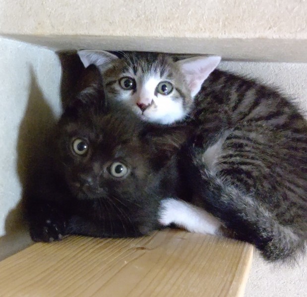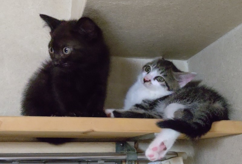 | 特徴(性格など) | シュッとした白キジの美猫『ミチル』ちゃんとまん丸お顔の黒猫『チルチル』君 二匹とも尻尾は真っすぐで、どちらかというと大人しめの子猫だと思います。チルチルの方が少しビビりですが、二匹とも爪切り・抱っこできます。 二匹とも子猫らしく毎日ゆる~くじゃれあっています。 とても仲良しな為、できれば一緒に飼って下さる方を優先させて頂きます。 |