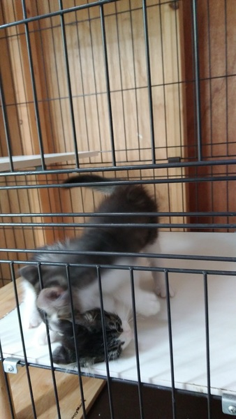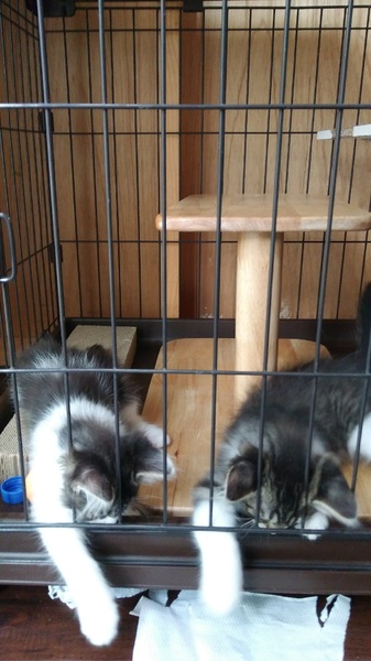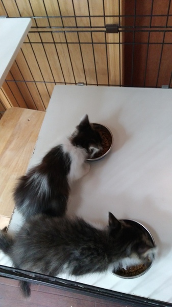 | 里親募集する理由 | 当方の家族(弟)が仕事で徳島市内を車で走行中、信号待ちをしていた前の車のボンネットの中から子猫の兄弟が飛び出してきて、保護しました。(前の車の運転手によると、子猫の声が聞こえるからおかしいなと思いながら走っていたとの由)放置すれば車道で車に敷かれていたところを命拾いした子達です。 ノミが大量に寄生しており猫風邪もひいていましたが、ノミ駆除済み、猫風邪治療済み(目薬のみ継続中)、何度検便しても寄生虫は出ませんでしたが、念のための虫下し薬済み、猫エイズ、白血病ともに陰性。よく遊ぶ元気な仲良し兄弟です。 |