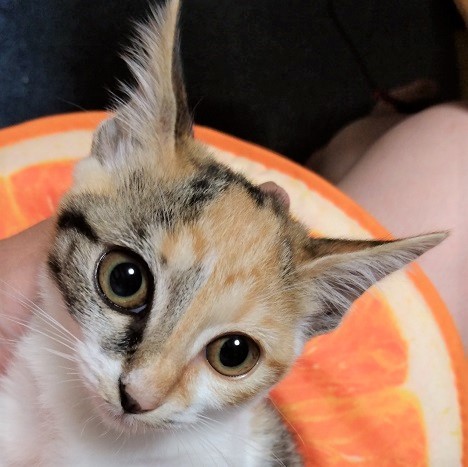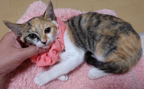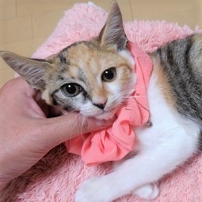 | 特徴(性格など) | 三毛、まっすぐの長しっぽです。 人なれしやすい、猫初心者も大歓迎な子です。 なでなで大好きで、おなかをだしておねだりします。 触るのも抱っこも余裕★のなれなれシンクロきょうだいねこ(妹)です。 しょういちくん(兄・茶白)、きょうだいご一緒のご縁があればうれしいですが、一匹ずつでも譲渡は可能です。 |