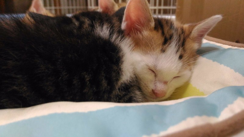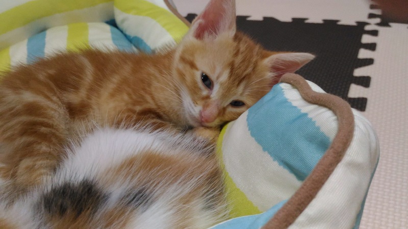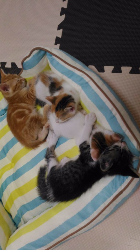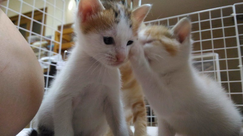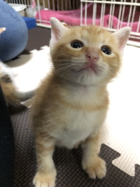 | 特徴(性格など) | 茶トラ→オス:マイペースでヤンチャ。短いシッポをプルプルします。 三毛 →メス:食いしん坊で甘えん坊。切りすぎた前髪にまろまゆがついています。 6月17日産まれ。4兄妹のうちの2匹で、そっくりのたれ目がとってもキュートです。 トイレトレーニング済。上手にできます。 血液検査などはしておりませんが、母猫はエイズ白血病ともに陰性でした。 出産から飼育まで完全室内で育っており、外に出たことは一度もありません。 2ヵ月になったらワクチンを接種予定です。 |