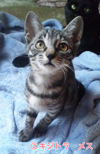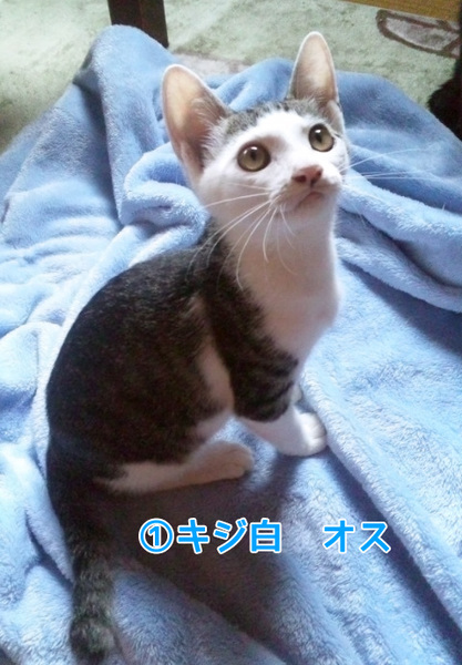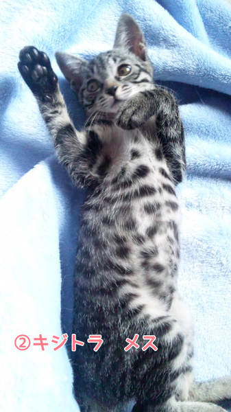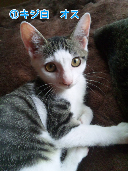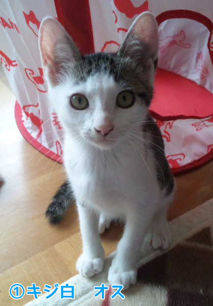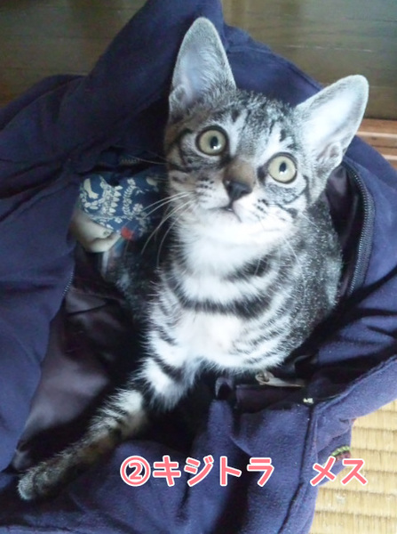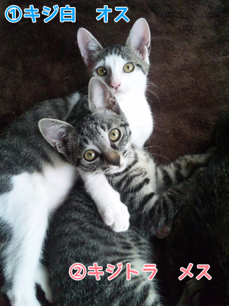| 特徴(性格など) | (1)キジ白・オス・生後3月半・よく遊びよく食べます。 (2)キジトラ・メス・生後2ヶ月半・怖いもの知らずで積極的。 ワクチン接種1回・エイズ白血病陰性 |