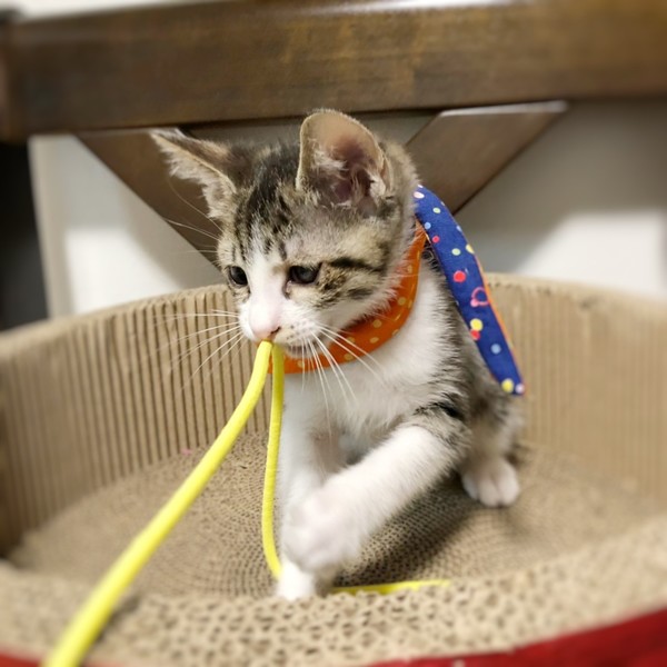 | 特徴(性格など) | キジ白の男の子です。甘えたさんで、人のあとをおって、ついてきます。 膝の上も大好きです。 120グラムのときから、ミルクで育ててもらいました。 風邪をひいたとき、片目が少しだけ白濁しましたが、ちゃんと見えています。生活に支障はありません。 風邪も治り、元気に過ごしています。 どうか、マメくんに会いにきてください。 |