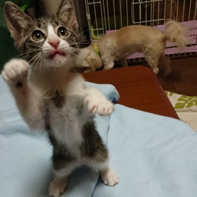 | 特徴(性格など) | 仮に「オリーブちゃん」と呼んでいます。 生後2日程で保護され、人が育てましたので、超がつく甘えん坊さんです。 肩に背中にとよじ登って、ゴロゴロゴロと甘えます。 診察室でも先生にゴロゴロで心音が聞こえない~。 兄妹と元気に遊んでいます。 ゴマ君と兄妹です。 ワンコさん次第ですが、預かり宅のワンコさんとは仲良くしています。 |