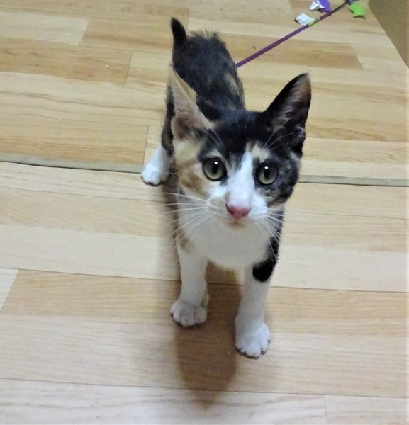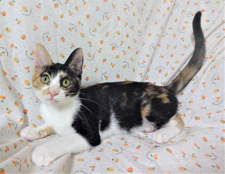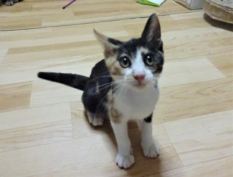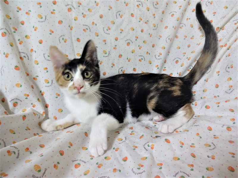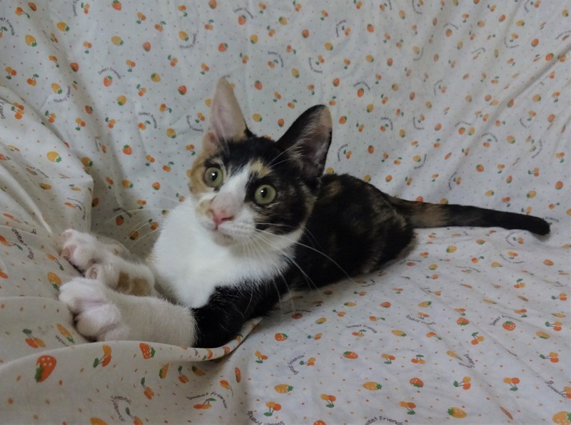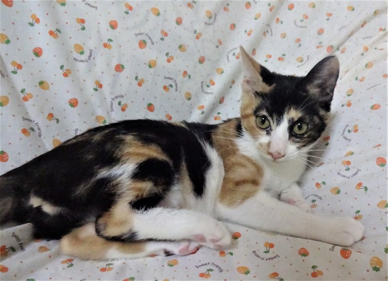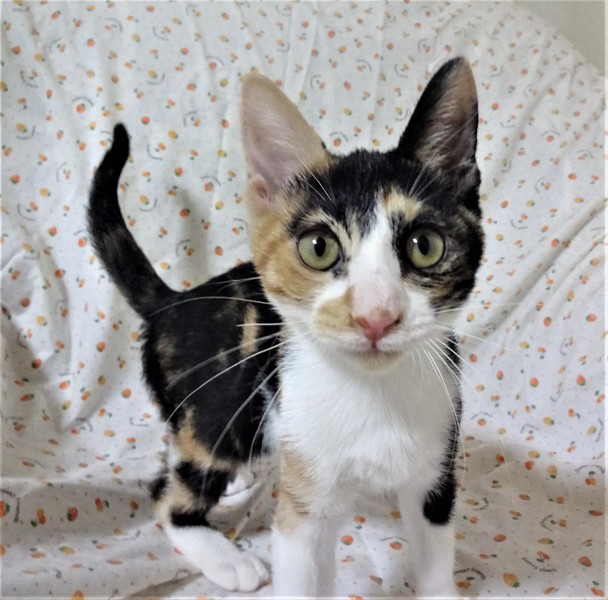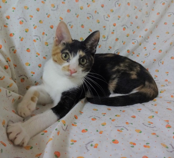 | 特徴(性格など) | 仮名: 八重ちゃん(メス) 毛色: オーソドックスな三毛です。 尻尾は長い 性格: 人懐こい、元気ジルシのイケイケですが、怖がりの面もあり、掃除機などは怖いようです。また、気の強い面もありますが、ケージに近づくだけで、抱っこをせがんだり、ケージを開けると肩に乗ってきたりします。 のみ取り済 検便済 駆虫済 3種混合ワクチン済 猫エイズ・白血病ウィルス検査はともに陰性 |