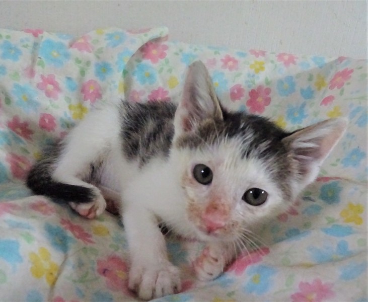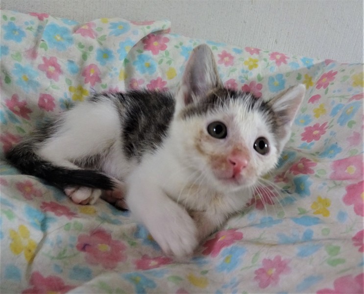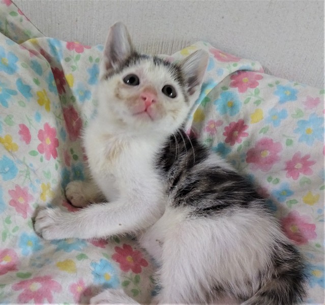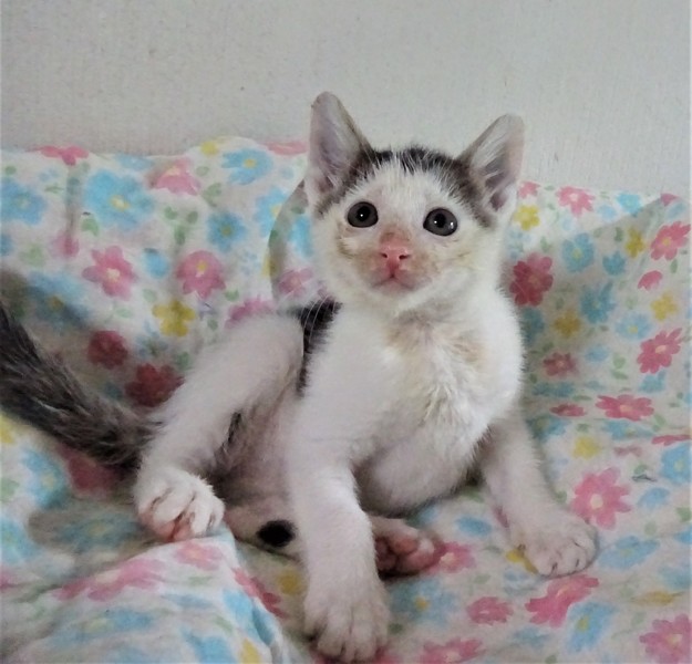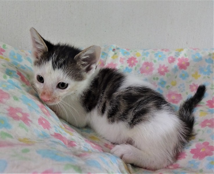 | 特徴(性格など) | 仮名: シオンくん(オス) 毛色: 白キジ、額は富士額。長い尻尾です。 性格: 小さいけど、結構活発で、にゃんプロではいつも上に乗っかって、兄妹を鳴かしています。 人馴れも問題ないです。 兄弟はいつも一緒にいるので、一緒にエントリーしているカノンちゃん、ハリー君のうちのどちらかと一緒のお家に行けると嬉しいです。 少し小さめの子なので、暫くは、お留守番の少ないお家で見守って頂きたいと思います。 のみ取り済 検便済 駆虫済 3種混合ワクチン済 猫エイズ・白血病ウィルス検査はともに陰性 |