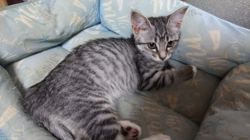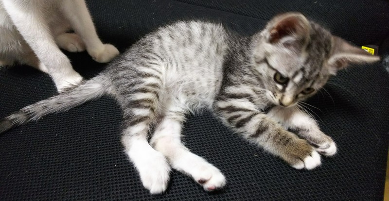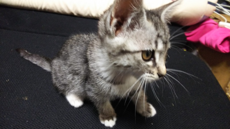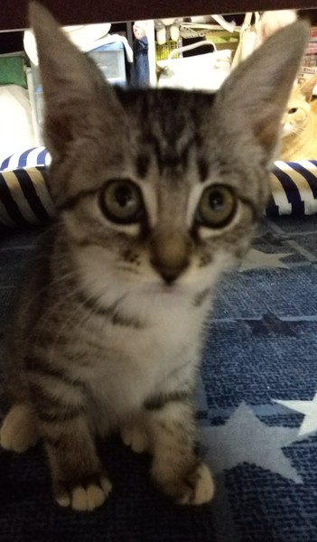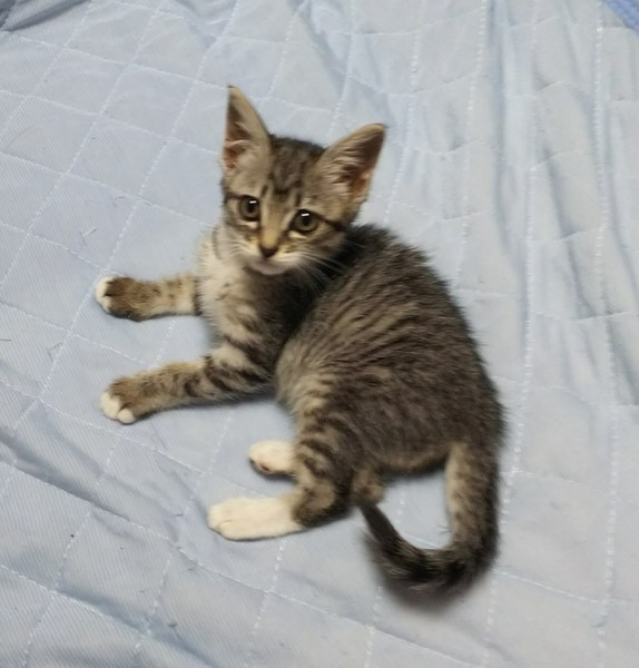 | 特徴(性格など) | 白サバトラでしっぽが長いです。手袋をつけているみたいに、白が入っています。人や他の猫にも物怖じせず、ネズミのおもちゃで遊ぶ元気な子猫です。撫でられるのが好きでゴロゴロ喉を鳴らして甘えます。 | ||
