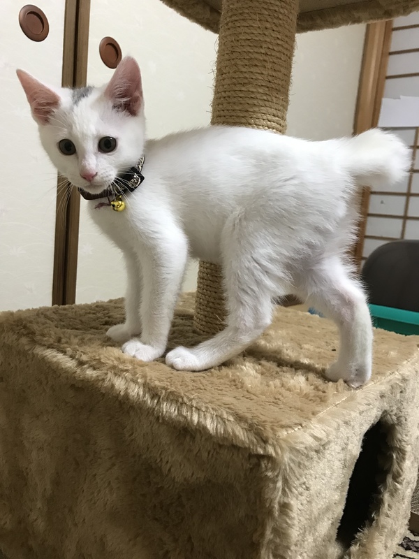 | 特徴(性格など) | 白色に頭にグレーの模様。 人懐っこい元気な子です。 尻尾が短いけど丸くて可愛い尻尾です。 |