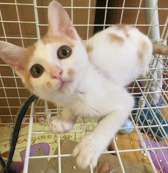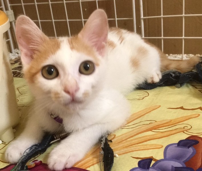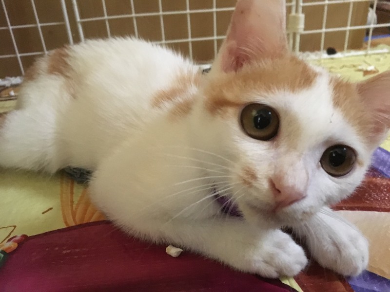 | 特徴(性格など) | 白字に茶のブチが少し。尻尾は少しかぎしっぽ。スマートなタイプで綺麗な子だと思います。 保護当時衰弱してガリガリだったので、もしかしたら大きくなって丸くなるかもしれませんが、今はかなり細身です。 性格はとてもビビりで臆病ですが、人がケージに近付けばすぐに甘えてきますし、抱っこされる前からゴロゴロ言ってます。元気になったので、遊び方もだんだん激しくなっています。 |