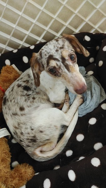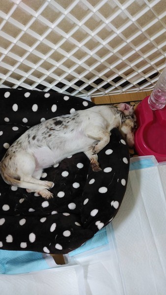 | 特徴(性格など) | 白黒のダックス 子犬だけあって慣れてきて、段々いたずらを発揮しています。他の犬、猫とも大丈夫。お散歩練習中、トイレは外でもシートでも出来ますが、失敗もあります。 | ||