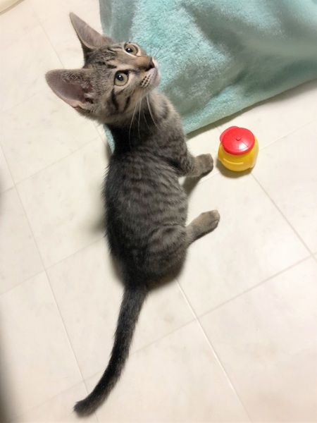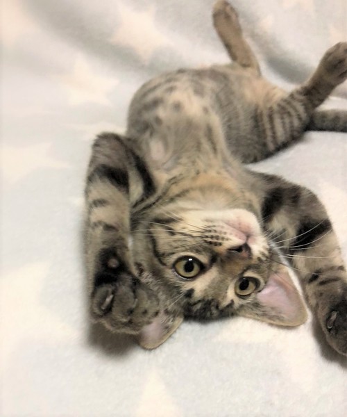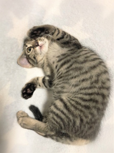 | 特徴(性格など) | 仮名、カナダ 細かいしましま女の子。 数日で環境に慣れ、膝に飛び込んで来る甘えん坊になります。 仰向けに持ち上げても、だるんだるんされるがまま 目の前から隠れてちらっと覗くと、ひょっこり首を伸ばして探す可愛い子です。 暑い日でも近くにいたいようで、必ず人のそばで眠る甘えん坊です。 |