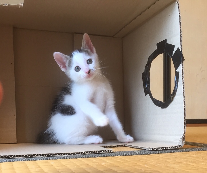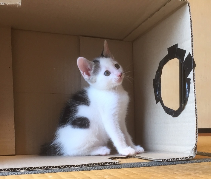 | 特徴(性格など) | 6月25日誕生。8/4現在体重、700gです。白黒柄で尻尾の長さは中くらいでまっすぐです。 知人が野良の母猫を家猫にしたいと、捕獲して避妊手術を受けさせるために動物病院に連れていきました。ところが、預けた病院で翌日出産したそうです。そのまま3週間ほど病院で過ごさせてもらい、子猫だけ里親募集の為私たちが引き受けました。3兄妹でしたが、2匹は里子に行き、残った子の里親さんを募集しています。 病院育ちなので、健康面に問題はなくとても元気です。ご飯は、子猫用のドライと缶詰などを食べています。トイレのしつけはできています。人懐っこい子で、また甘えん坊の優しい子です。 |