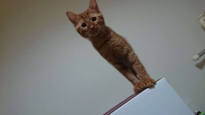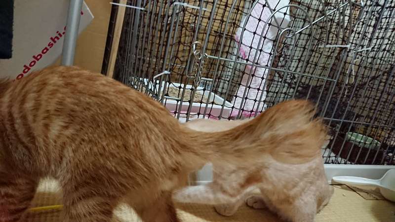 | 特徴(性格など) | カギしっぽです。先端がほぼU字になっているので、毛がボサボサに見えます。 保護時の猫風邪の影響で、瞳が眉間に寄っているように見えます。 視力に問題はありません。 性格はおとなしいです。 少しどんくさいです。 |