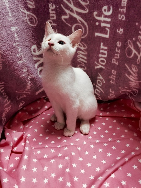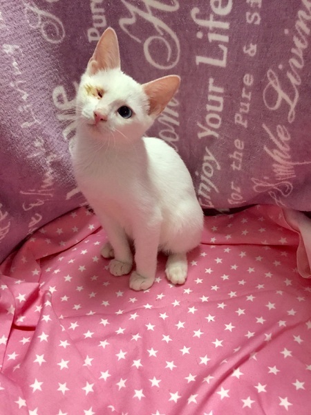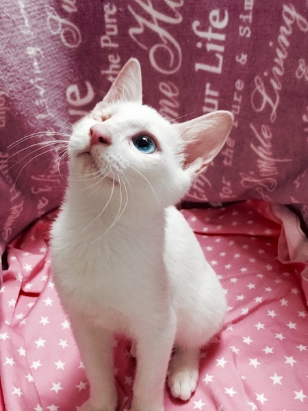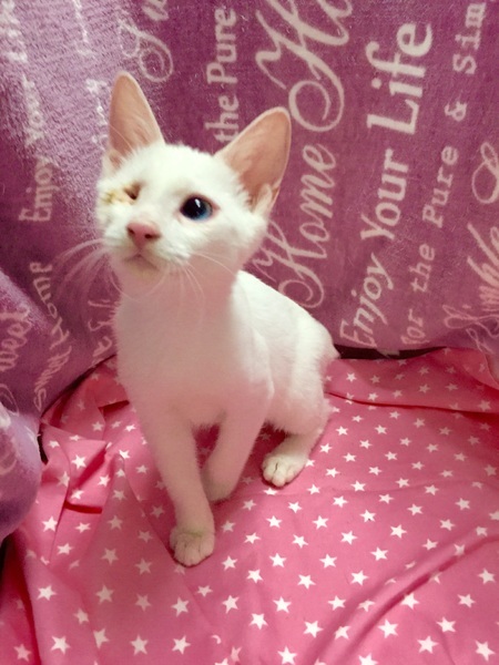| 特徴(性格など) | 【仮名】ユリアくん 【性格】ブルーの可愛い目をした男の子です。遊ぶのも好きですが、人の側にいるのが好きで撫でて~と寄ってきます。抱っこも大好き!目に障害があっても普通の子と変わりなく生活できます。遊びも負けてません。 同世代のにゃんことのお迎えを希望します♪ 先住ちゃんがいる場合は1匹でもOKです。 |
