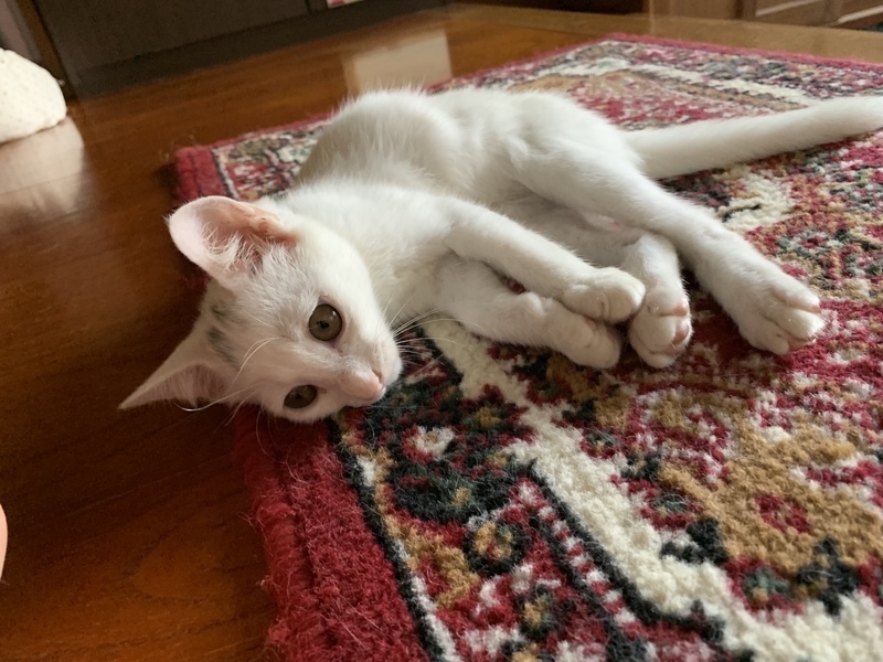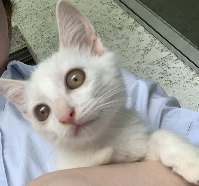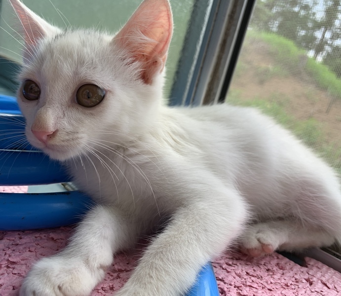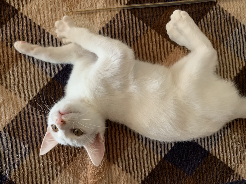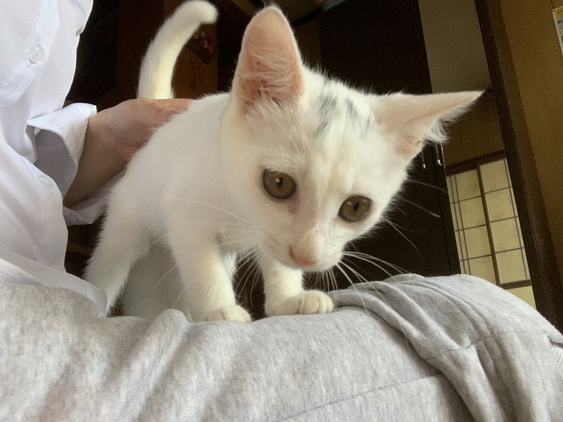 | 特徴(性格など) | 白猫(雑種)おでこの黒い点々が可愛いです。 おっとりしてて控えめな性格ですが、撫でられたり抱っこされるのが好きな甘えん坊です。 お兄ちゃん達にくらべると体格小さめ。 5種混合ワクチン、駆虫済 |