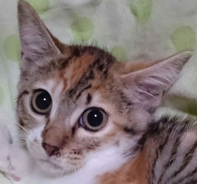 | 特徴(性格など) | 【仮名 紅葉ちゃん】とてもカラフルでもみじのような色合いの三毛猫です。少しおくびょうでビビりなところもありますが、抱っこはさせてくれます。人馴れ修行中です。三姉妹でじゃれたりして遊ぶのが大好きです。 | ||