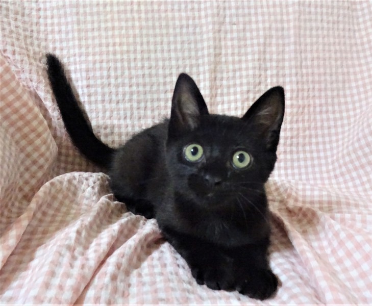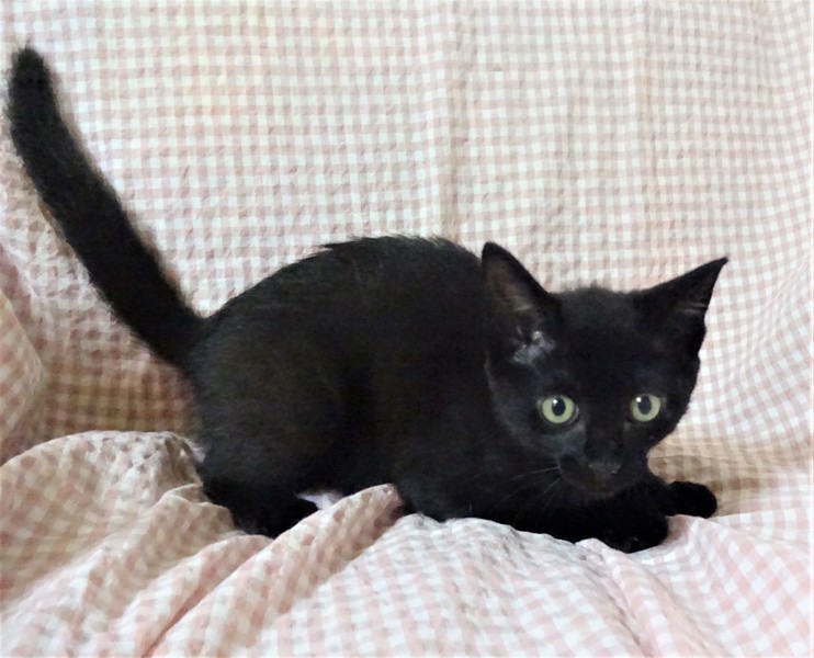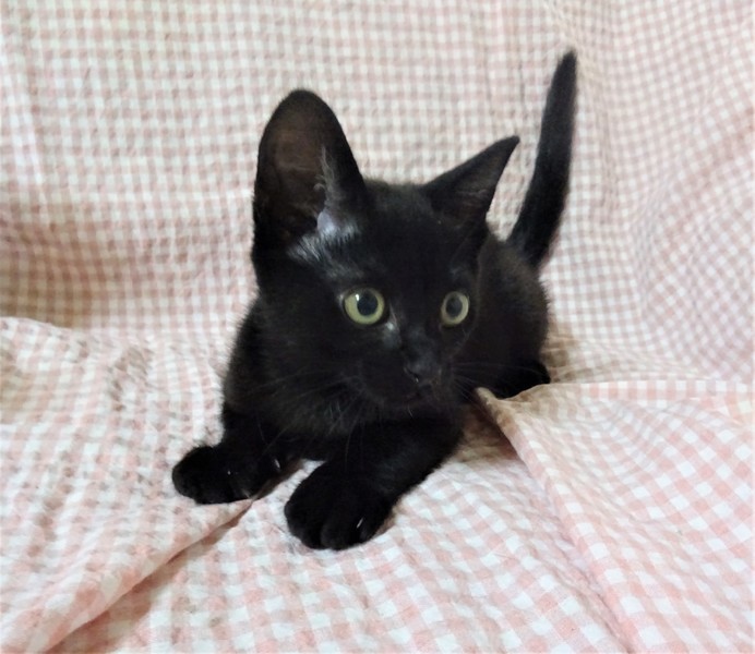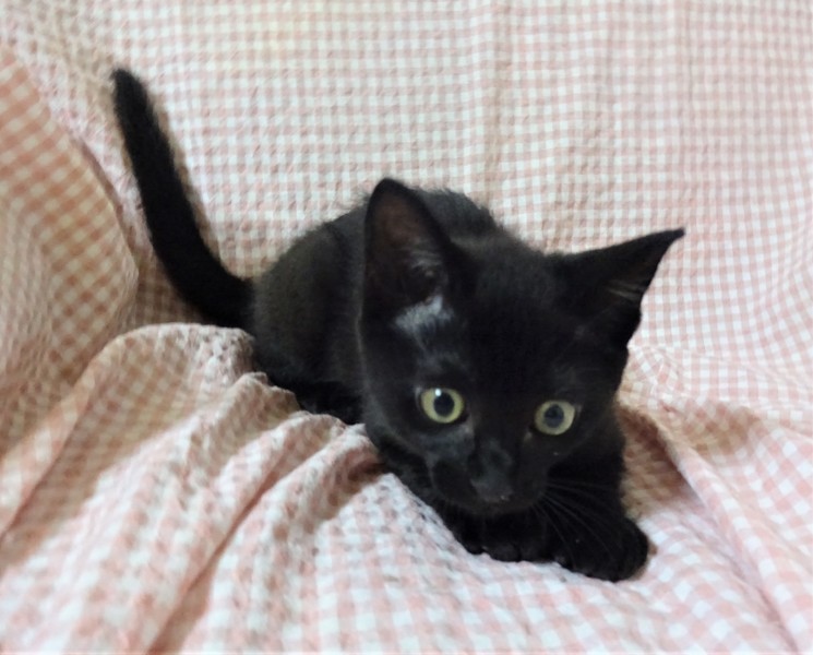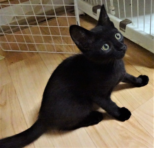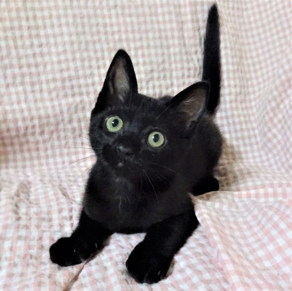 | 特徴(性格など) | 仮名: 太陽君(オス) 毛色: 黒猫、尻尾長い。細身。お腹に真っ白な丸模様があります。 性格: 威嚇なく人懐っこい子で、甘えん坊です。 立っていると足元にスリスリしたりよじ登ったり。抱っこすると顔をくっつけたり、舐めたり。他猫とも上手く付き合っています。にゃんプロも好きなので、毎日、張り切って遊んでいます。 のみ取り済 検便済 駆虫済 3種混合ワクチン済 猫エイズ・白血病ウィルス検査はともに陰性 |