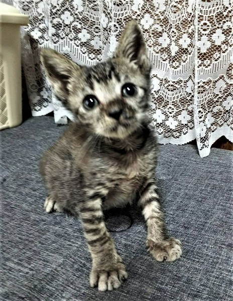 | 特徴(性格など) | 仮名: 陽人(はると)くん 毛色: キジトラ、尻尾短め 性格: 猫見知りなく、人見知りもない、とても懐っこい子です。 小さめですが、元気一杯で、走りまくるのが大好きです。 今は、同じ月齢の子がいないので、ちょっと発散出来ない所もあります。 大人猫とプロレスしても負けますので、続きません。発散させるために人が遊んでやらなければいけません。 甘えん坊で、人が好きな子の相手をしてやってください。 のみ取り済 検便済 駆虫済 3種混合ワクチン済 猫エイズ・白血病ウィルス検査はともに陰性 |