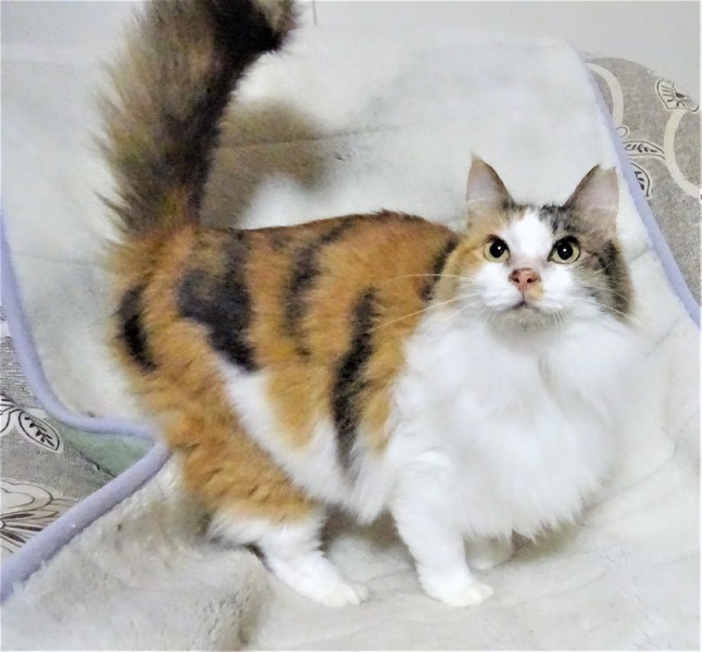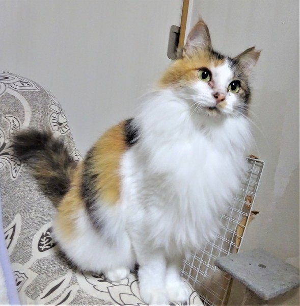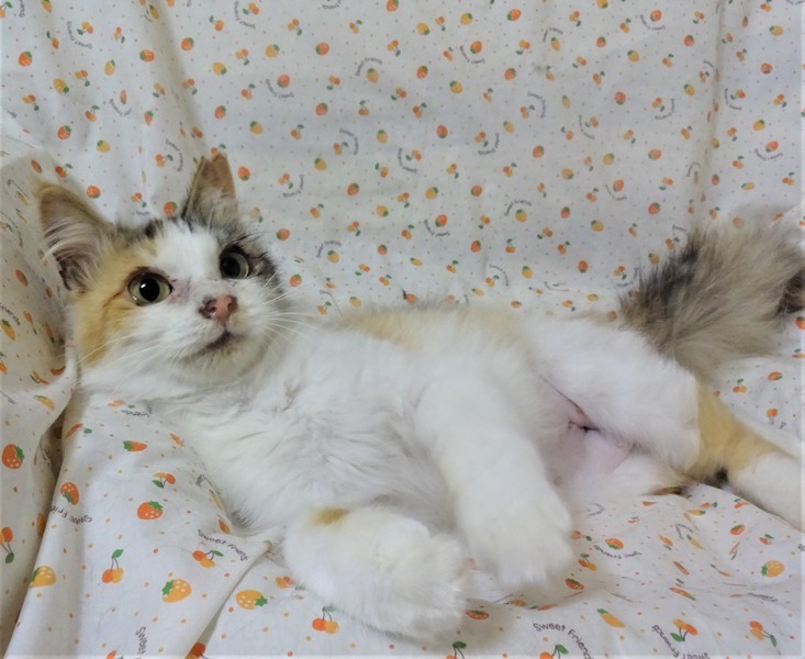 | 特徴(性格など) | 仮名: きなちゃん(メス) 毛色: 長毛の淡い三毛です。 尻尾長い。 性格: 人懐こく、スリスリのにゃんこです。 デリケートな部分があり、少し不安症のような症状がありましたが、それも治り、今は、沢山の子猫と遊んでいます。出産経験はあるようで、子猫を可愛がります。 他の大人猫とも上手く付き合えると思います。 甘えたいのに甘えられない寂しい環境に一時的にいたため鳴き続けたようで、声が出なくなっています。うんと甘えさせてくれるご家庭で可愛がってもらえると嬉しいです。 のみ取り済 検便済 駆虫済 3種混合ワクチン済 避妊手術済 猫エイズ・白血病ウィルス検査はともに陰性 小さい頃に引いた風邪の影響で、目と鼻が弱いようで、鼻水が出たりくしゃみが出たりします。 |