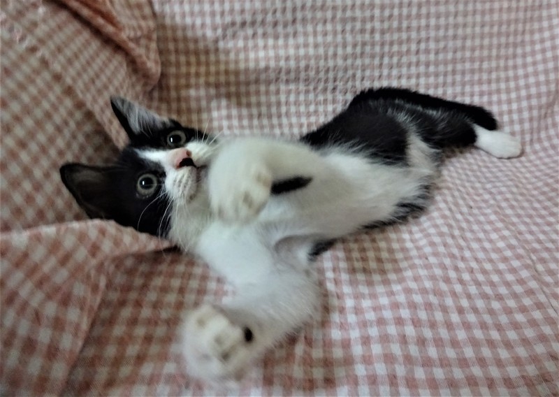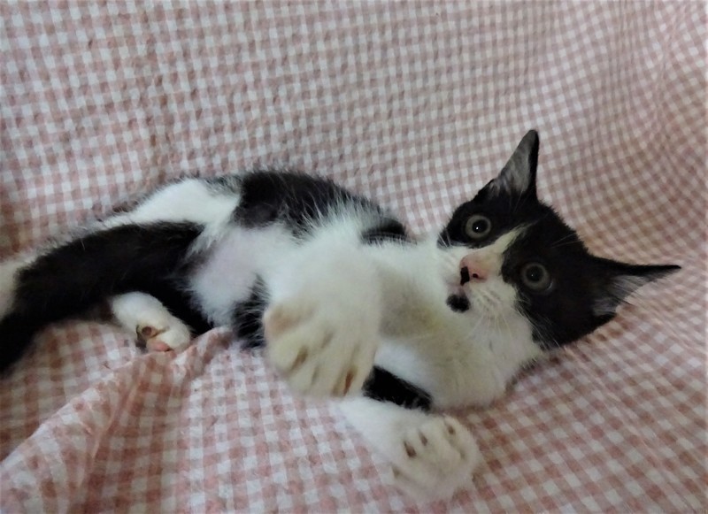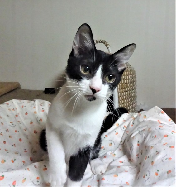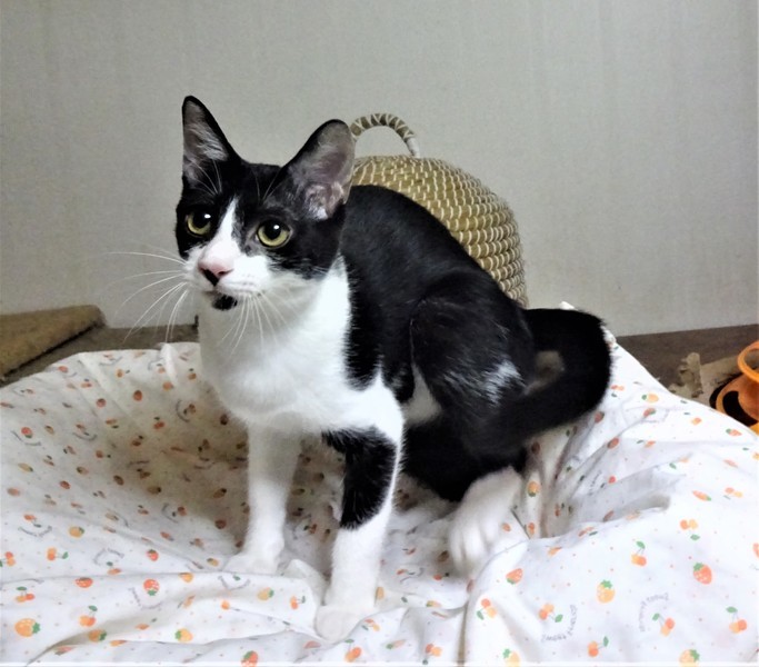| 特徴(性格など) | 仮名: ゴマ君(オス) 毛色: 黒白、尻尾長く、あごに模様 性格: 威嚇なく、抱っこも平気で甘えます。2週間隔離して保護部屋に入れていますので、同じ月齢の子と遊ぶ機会がなく、初めは遊べませんでした。 遊ぶよりも探検!冒険!でしたが、少しづつプロレスもしています。いまでは、上手に付合っていて、自分より小さい子を遊んでくれます。 のみ取り済 検便済 駆虫済 3種混合ワクチン済 猫エイズ・白血病ウィルス検査はともに陰性 |