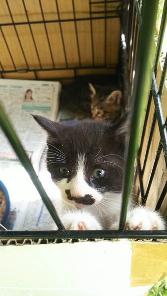 | 里親募集する理由 | 山奥の小屋で産まれた子猫です。野性動物にやられてしまうので保護しました。可愛いチョビヒゲ子猫の良縁を探しています。 | ||