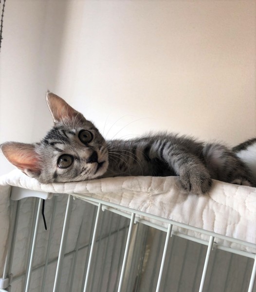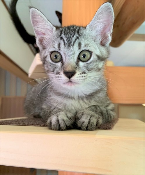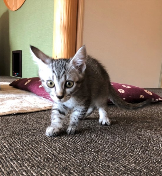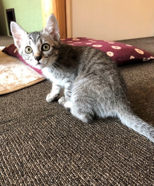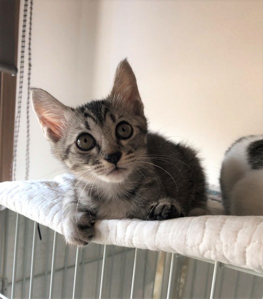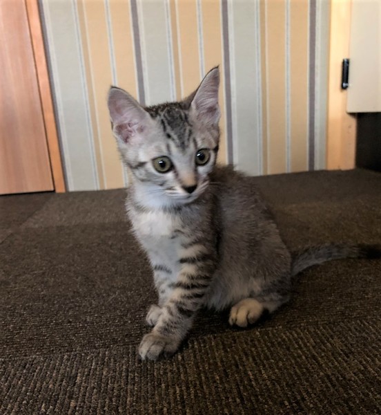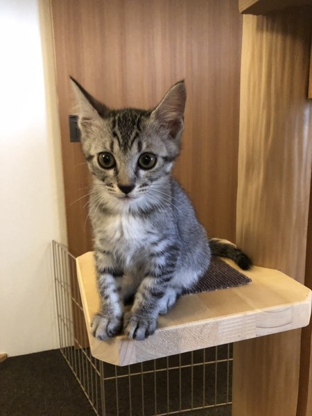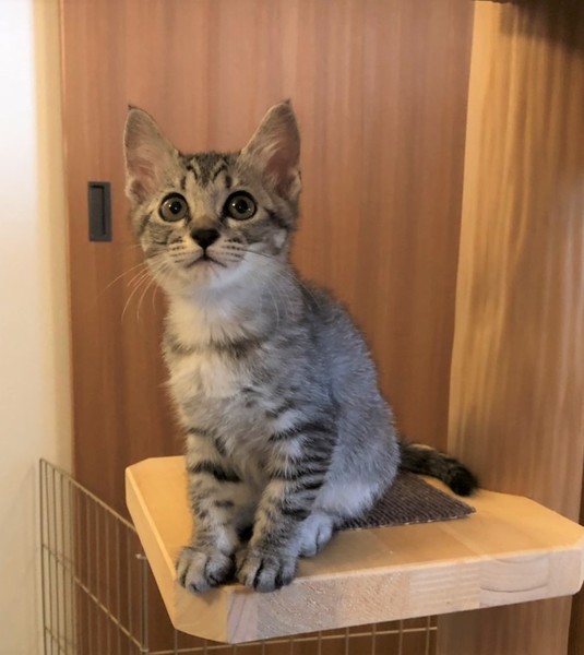 | 特徴(性格など) | 明るいしましまキジトラの女の子。 数日で環境に慣れ、ゴロゴロの甘えん坊。 好奇心旺盛で、クリクリの目で色んな物を観察。 毎日元気に兄妹達と遊んで過ごしています。 |