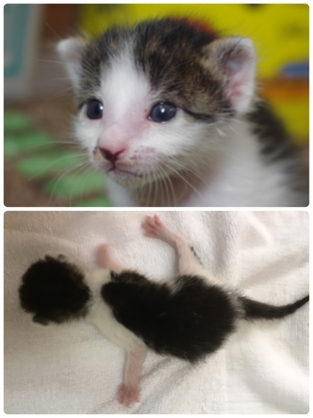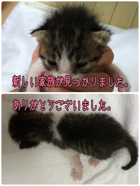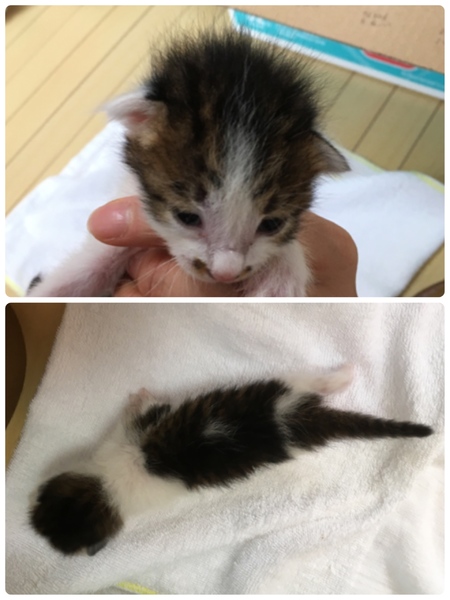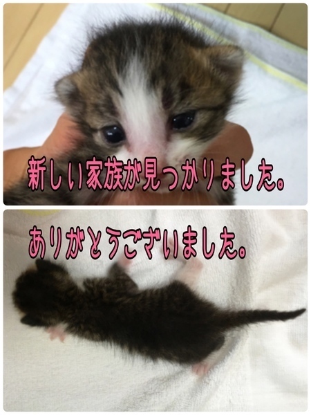 | 里親募集する理由 | 8/14に河川敷で、段ボールで捨てられているところを保護しました。 現在生後3週で、ミルクを飲んで元気になってきたので、離乳食を開始しました。皮膚状態やおしりも綺麗です。 17日に動物病院を受診しました。 今後、1ヶ月半で寄生虫検査、2ヶ月でワクチン接種となります。 0才3才の子どもがいるので、引き渡し場所は要相談になりますが、懸命に生きる小さな命のため、なるだけ努力します。 よろしくお願いします。 |