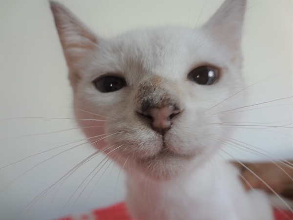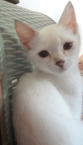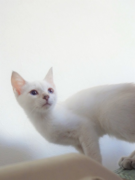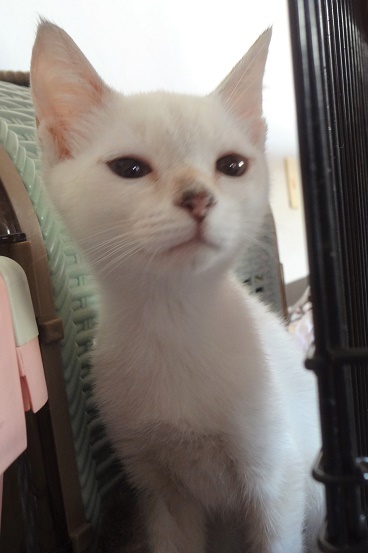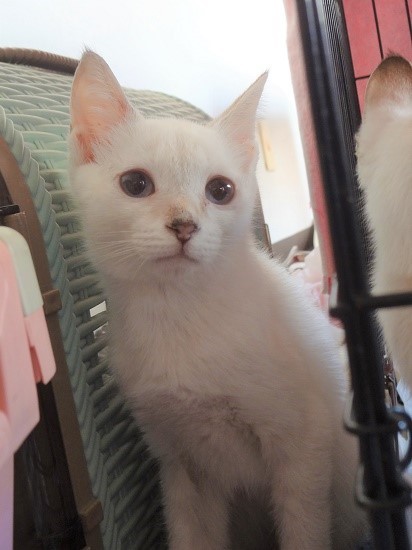 | 特徴(性格など) | 大人しい女の子です。 全身はキレイなまっ白で、耳鼻しっぽにシャムMIX特有のシールが出ています。 淡いブルーの瞳。 おっとりしてますが、玩具でよく遊びます。 ちゅーる大好きです。 食事:ドライフード トイレ:失敗なし 爪切り:できます エイズ・白血病:陰性 |