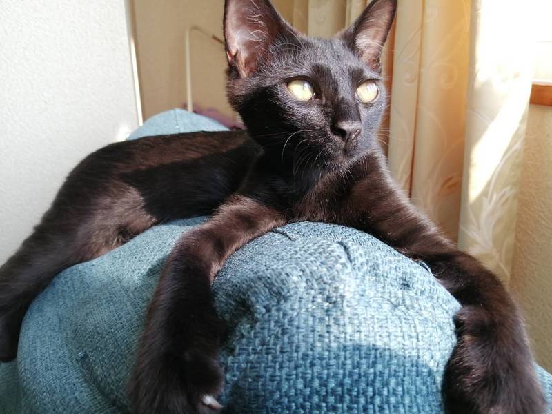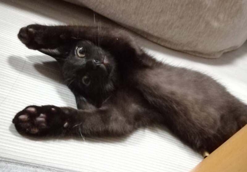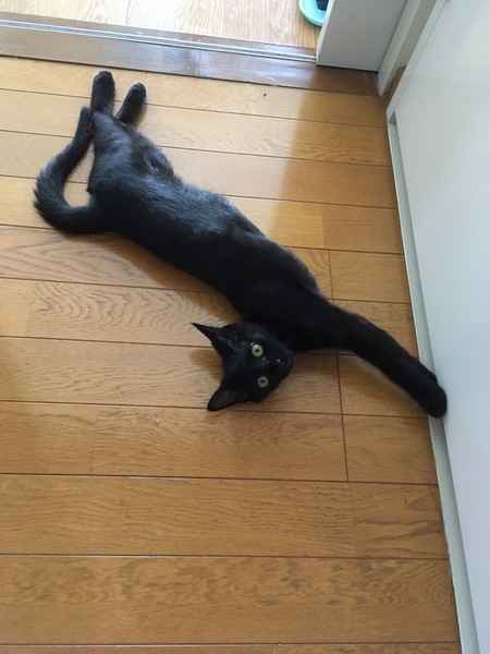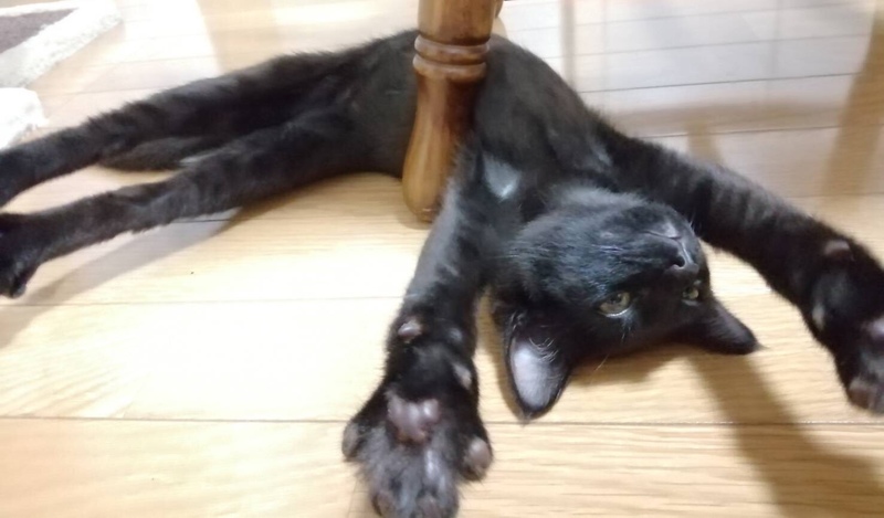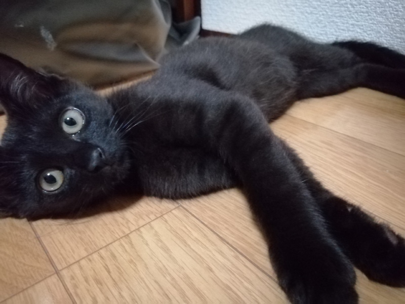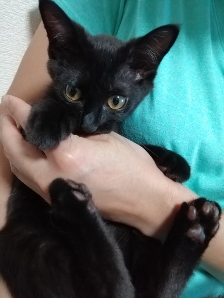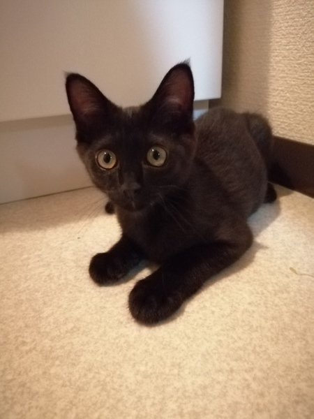 | 特徴(性格など) | 黒色,眼は金色,サラサラでツヤツヤの被毛 とてもフレンドリー 新しい環境に慣れるのに必要な期間は1日以内と予想されます. とても元気で活発.よく遊び,よく食べ,よく寝る子です. 人間が大好きで,一時も人間から離れたくないそうです. おもちゃ遊びが好きで,「遊ぼう!」とおもちゃを持って来ます. |