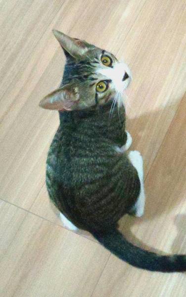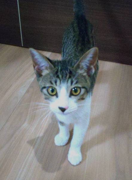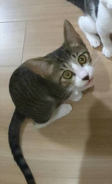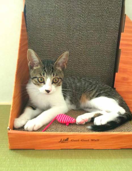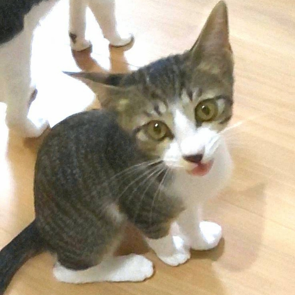 | 特徴(性格など) | 仮に「みつきちゃん」と呼んでいます。 小顔で耳が大きいキジシロの可愛い女の子です。少し怖がりさんですが、慣れるとゴロゴロ、ぴったりはりついて眠ります。 おもちゃが大好きで、すぐに飛んできます。 ミーミーとっても可愛い声でご飯をおねだりします。 尻尾は長めでまっすぐ、先端が白くて個性的です。 兄妹ではありませんが、同居しているマスオさんと仲良しです。 |
