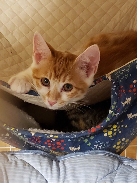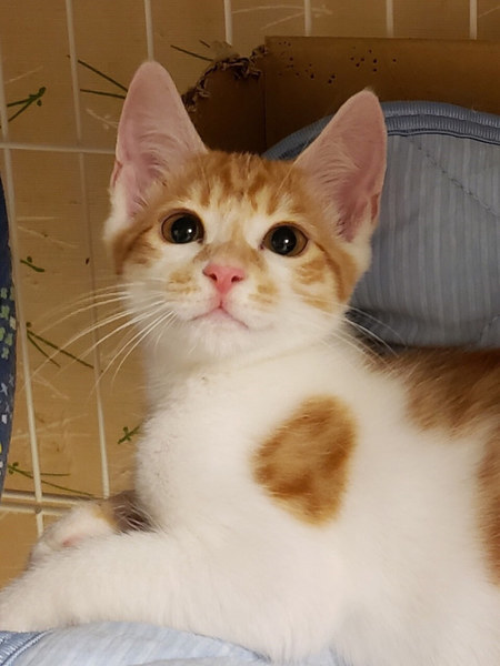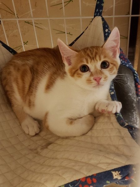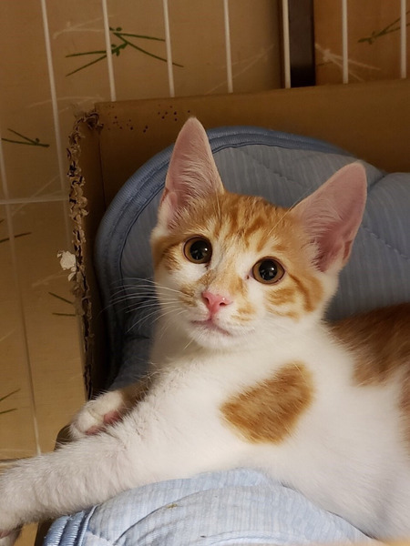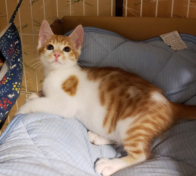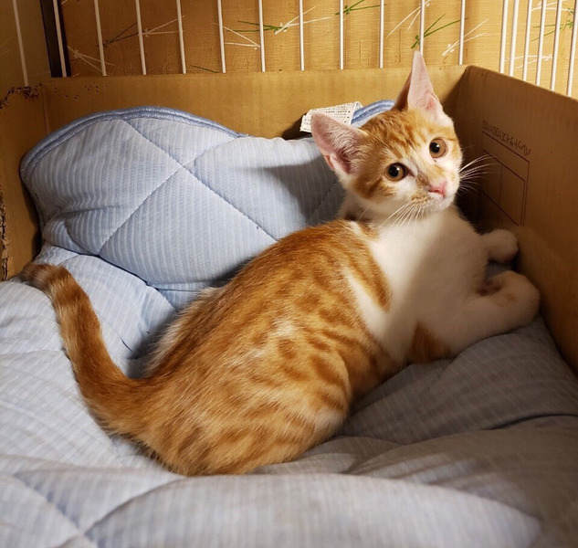 | 特徴(性格など) | ボクは、うみくんでちゅ ヘタレ男と呼ばれているよ シャー!ってまだしちゃうけど、抱っこされてナデナデされちゃえば、直ぐに寝返っちゃうよ。 ボクね。おもちゃで遊ぶの大好きにゃんだ。 猫じゃらしがあるとボクは、幸せにゃんだな。 同じキョウダイのカフカちゃんといつも一緒にお昼寝してるよ。 ボク達キョウダイを、よろちくおねがいしますにゃ♡ ――――――――――――――――――――――――――――――― 茶トラ白のかわいいオスくんのご紹介です。 性格は、ヘタレくんです。 まだ怖くて、シャー!としてしまいますが、抱っこもナデナデも余裕です。 ナデナデしていれば、そのうちゴロゴロ言います。 まだ遊びたい盛りなので、猫じゃらしなどのおもちゃで遊ぶのが大好きです。 同じく一緒に保護したキョウダイのカフカちゃんと大の仲良しです。 同じキョウダイでも、性格は全く真逆で、カフカちゃんは三毛猫のメスちゃんなので、ツンデレタイプです。 この全く性格の違う2匹キョウダイの馬がよくあっているのだと思います。 この子達は、ケージに慣らしてあるので、ケージとハンモックがあれば、幸せです。 ケージの中にいる分には、2匹とも落ち着いてナデナデさせてくれます。 まだ、フリーにすると隠れてしまう感じですので、この子達を迎えてくださる方は、ケージのご用意をお願いします。 今回、うみくんを迎えてくださるご家庭は、出来ればキョウダイのカフカちゃんと一緒に迎えてくださる方を優先したいと考えております。 避妊、去勢手術をしてからお届けいたしますので、ある程度のお留守番も問題ありません。 譲渡会スタッフまで、ご相談ください。 かわいい子達ですので、ぜひとも、よろしくお願い申し上げます。 |