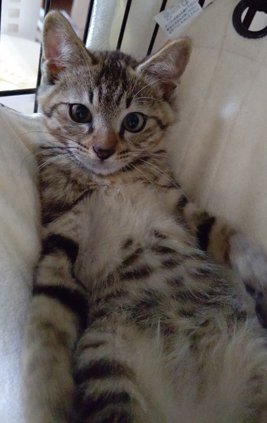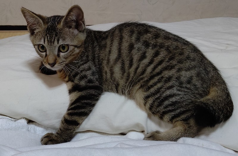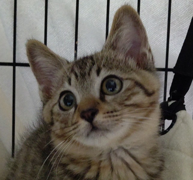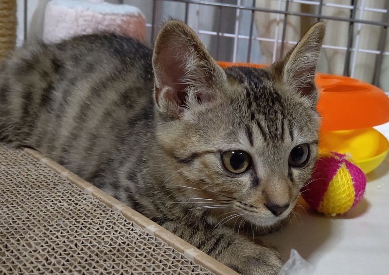 | 特徴(性格など) | 仮名は『そら』。 キジトラの男の子。生後4か月ぐらい。 尻尾は半分ぐらいの長さで、先が少し曲がっています。 やんちゃで、へそ天で寝ることが多く、どこかコミカルで愛くるしい子です。 爪切りも抱っこも問題なくでき、懐いてくればグルグルと喉を鳴らして撫でさせてくれます。 |