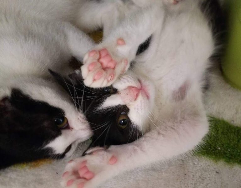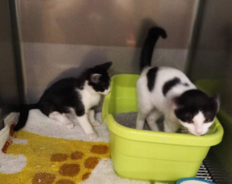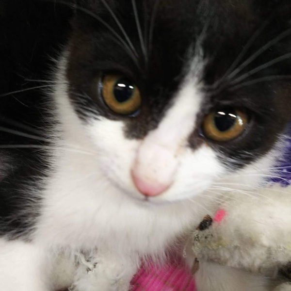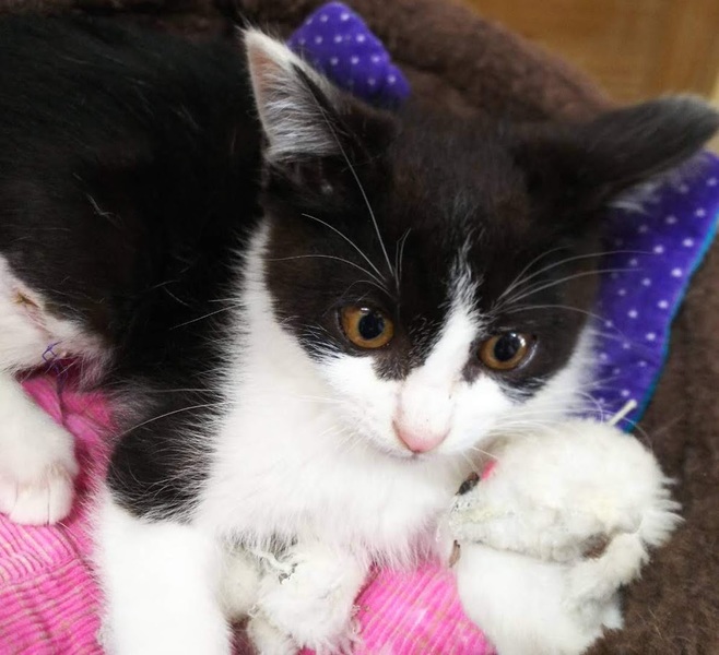 | 特徴(性格など) | 2ヶ月ぐらいのハチワレのオス猫です。 大腿骨骨折の跡がありますが、治癒してきています。 少しシャイな感じでしたが、だんだんと人慣れして、同じところで預かって貰っているコウメイ君ともよく遊ぶようになりました。 ノミダニ駆除、ワクチン一回済み。 血液検査済み。エイズと白血病はマイナスです。 |