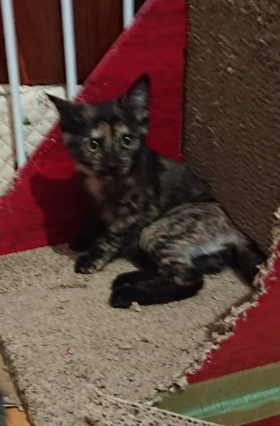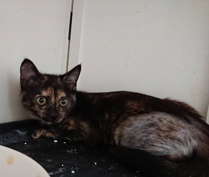| 特徴(性格など) | 仮名:まりもちゃん メス 毛柄:さび 推定6月生まれ エイズ・白血病ウイルス検査陰性 便検査済み ノミダニ駆除済み ワクチン接種済み トイレしつけ済み 後両足骨折、骨盤骨折治療済み 左後足の骨折は、ピンで固定手術しました。 その他の骨折は自然治癒。 お腹を出して「ゴロゴロ」甘えてきます。 抱っこも好きで、爪切り等もおとなしく切らせてくれます。 |