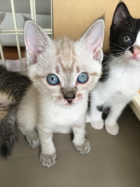 | 特徴(性格など) | 乳飲み子から育てている為、人馴れしているかわいい子たちです。 3兄妹とも月齢相応に活発で元気な子たちです。 それぞれ柄やしっぽが違います。シャムMixの男の子は長尾の先が幸せのかぎしっぽ♪ 3兄妹で仲良く過ごしています。のちのち猫仲間を探す方は多いのですが兄弟親子は相性で苦労することもなく、また社会性を育む為やお留守番もさみしくなく過ごせますのでご無理のない範囲でペア以上の兄妹でお迎えいただけますよう是非ご検討ください。 優しいご家族様お待ちしております! 【健康状態】 ・体内外駆虫薬投与済み ・検便(-) ・ジアルジア検査(-) ・エイズ(-)/白血病(-) ・お口周りに真菌の症状が少し出たため通院し服薬治療しました。 ・下痢が続いたため通院してお薬で経過観察中です。 便の状態以外は特に問題なく元気に遊んでいます。 |