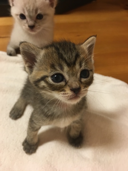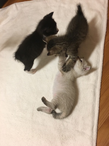 | 特徴(性格など) | 乳飲み子から育てている為、人馴れしているかわいい子たちです。 3兄妹とも月齢相応に活発で元気な子たちです。 それぞれ柄やしっぽが違います。キジトラの女の子は綺麗な縞模様の美猫ちゃんで短めしっぽ♪ 3兄妹で仲良く過ごしています。のちのち猫仲間を探す方は多いのですが兄弟親子は相性で苦労することもなく、また社会性を育む為やお留守番もさみしくなく過ごせますのでご無理のない範囲でペア以上の兄妹でお迎えいただけますよう是非ご検討ください。 優しいご家族様お待ちしております! 【健康状態】 ・体内外駆虫薬投与済み ・検便2回(-) ・ジアルジア検査(-) ・食欲旺盛でミルクも離乳食も良く食べてくれる子たちです。 ・他の兄妹猫たちのお口まわりに真菌の症状が出た為、一緒にいるキジトラちゃんも念の為、服薬(朝・夕)しています。 ・保護当初からお腹がゆるいことがあり、検便その他検査で異常なく、下痢が続いた時には下痢止めのお注射を2回ほど打ちました。胃腸薬、整腸剤を服用(朝・夕)して経過観察中です。 |