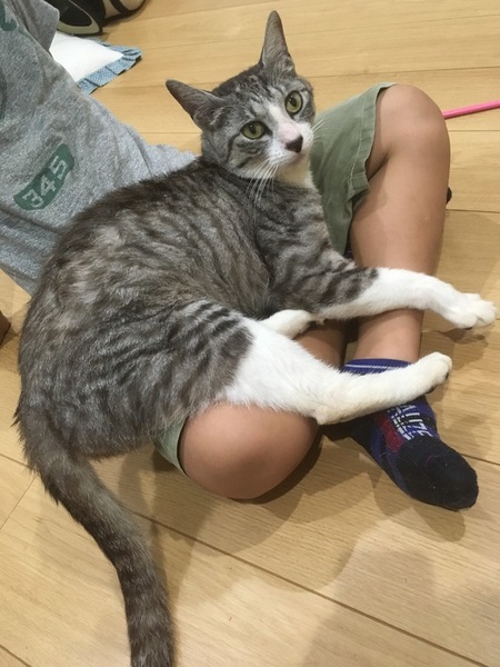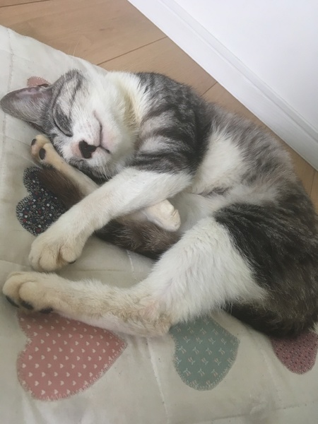 | 特徴(性格など) | サバ白。 人懐こくてすりすりします。後追いします。甘えちゃんです。とても元気でカリカリフードは早食いで完食します。 |