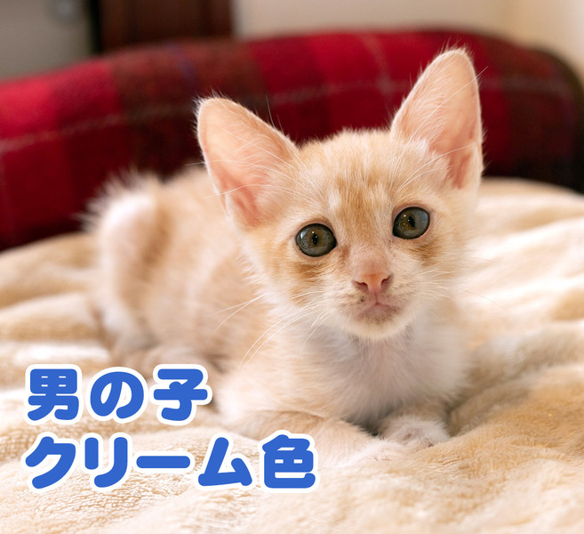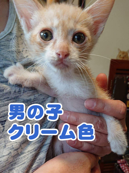 | 特徴(性格など) | とっても可愛くて優しい、クリーム色の茶トラ君です。 駆虫と、ワクチンを1回接種しました。 小さい時から人間に慣らしていますので、飼いやすいと思います。 |