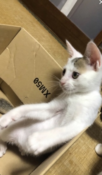 | 特徴(性格など) | とても人懐っこくて、元気いっぱい! 兄弟とじゃれあってよく遊んでいます。猫じゃらしやおもちゃもだいすき! 人が大好きで、抱っこされるとノドをゴロゴロ鳴らして喜びます。 お腹が空いた時は、ニャーニャーかわいく鳴いて教えてくれます。 白い被毛が多めの白キジで、とてもキレイです! |