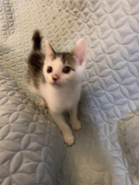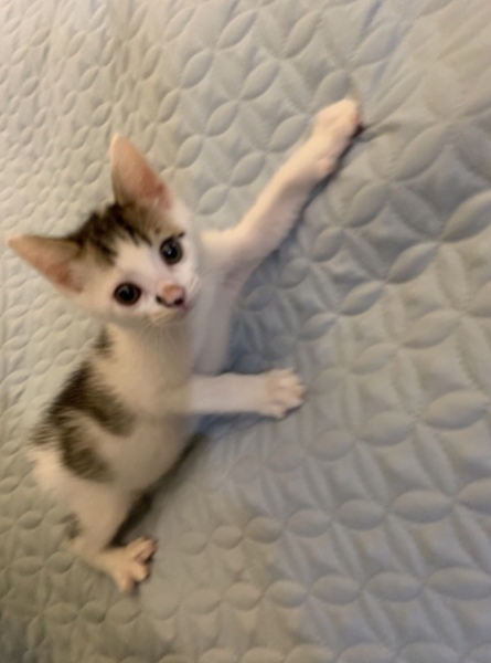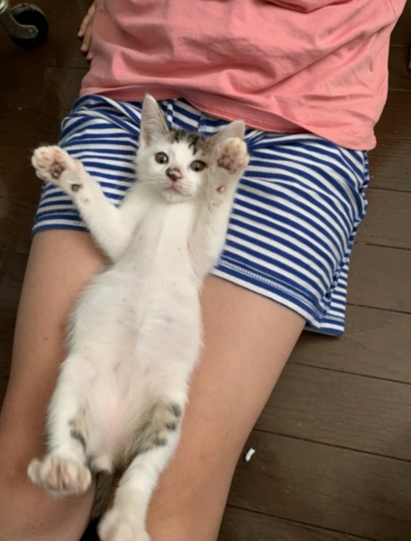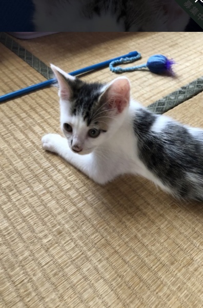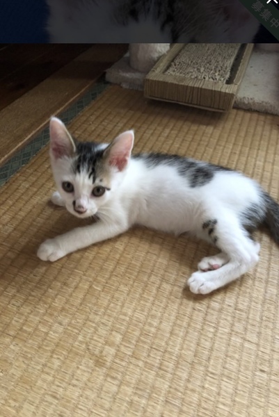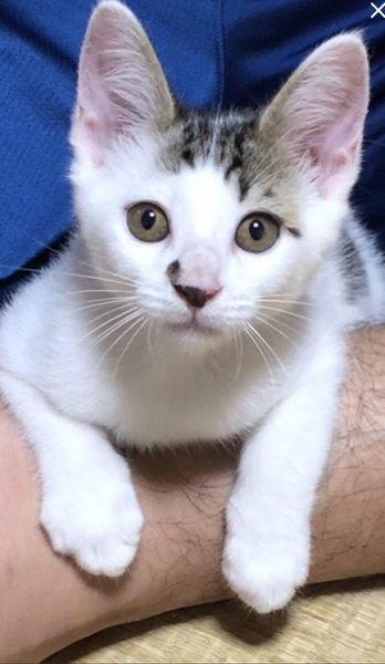 | 特徴(性格など) | とても人懐っこくて、元気いっぱい! 兄弟とじゃれあってよく遊んでいます。 おもちゃも大好きです。 人も大好きで、抱っこをするとノドをゴロゴロ鳴らして喜びます! 兄弟の中では身体が一番大きめの健康優良児。おっとりとした性格です。 モッフモフな白い被毛が多めの白キジです。 |