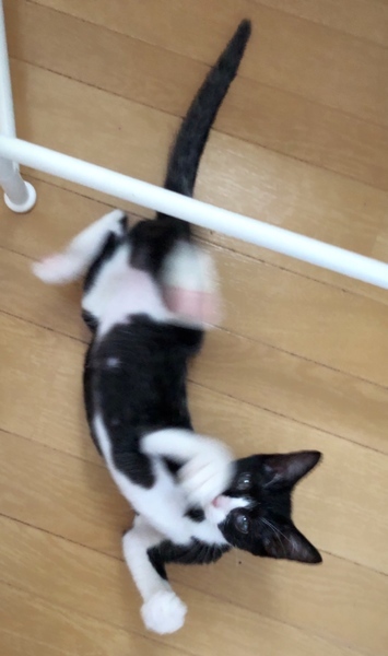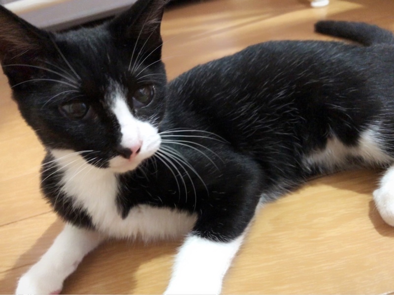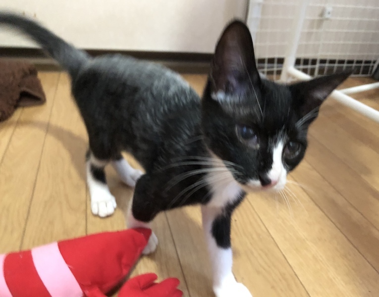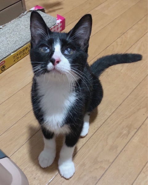 | 特徴(性格など) | 好奇心旺盛で、毎日元気いっぱいです! すりすりごろごろ、人見知りもなく、人間大好きの甘えん坊さんです。 白ソックス柄と、背中の白黒まじりの毛がチャームポイントです。 とても柔らかい毛質で、撫でるとふわふわです♪ |