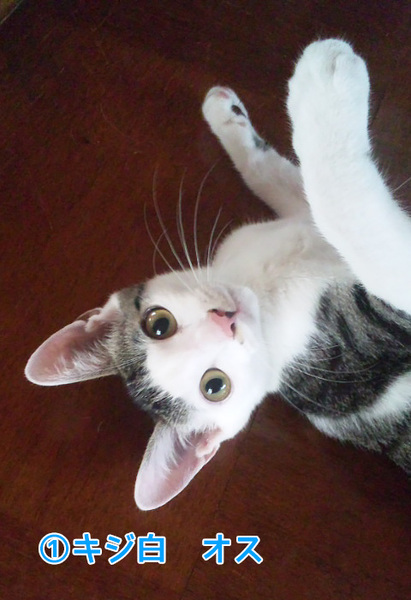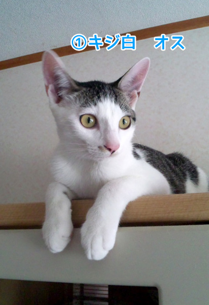 | 特徴(性格など) | (1)キジ白・オス・生後3月半・よく遊びよく食べます。 ワクチン接種済み・エイズ白血病陰性 |