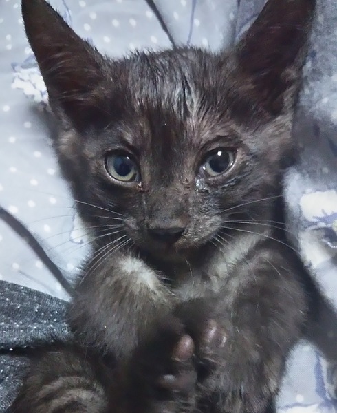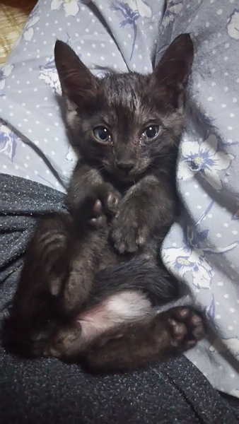 | 特徴(性格など) | 我が家で保護するとたまに来る性格100点満点の子猫。 空気は読めませんが、ゴロゴロ行って癒してくれる営業上手な子。 黒にキジ模様が入っています。 健康診断済み。駆虫、ワクチン済み(1回)。血液検査:エイズ、白血病陰性。 ご飯はウェットを与えていますが、カリカリも食べます(ただカリカリの食べが浅い) |