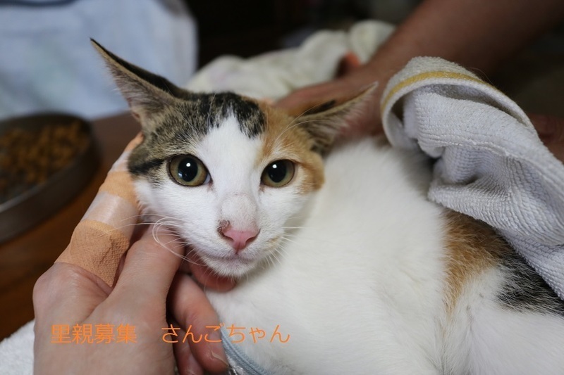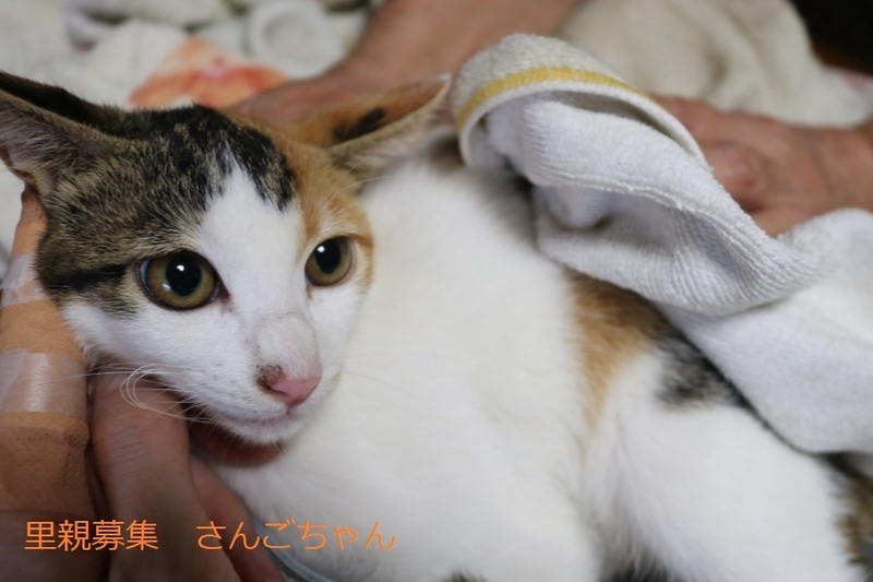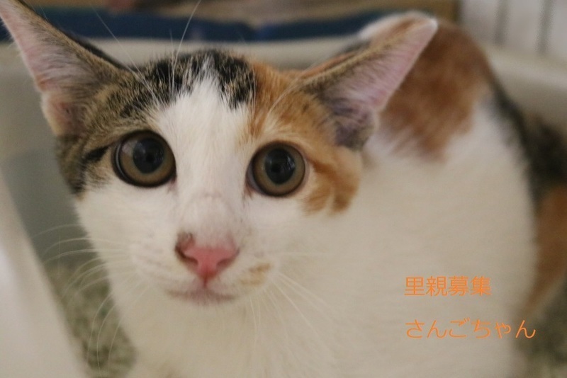 | 特徴(性格など) | 三毛子猫、女の子、仮名:さんごちゃん 推定生後4か月くらい(獣医師推定)、体重:1.76Kg(8/26現在) 健康診断済み、検便済み、フロントラインプラス済み(8/26)、 血液検査-エイズ・白血病-ともに陰性(8/26) 初回三種混合ワクチン接種済み(8/26) トイレしつけ済み 保護直後でまだ少し警戒心がありますが、綺麗な三毛さんです。 (9/19)避妊手術済み。 |