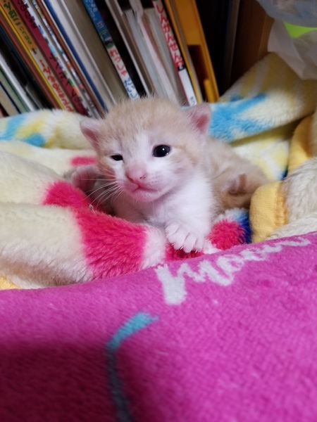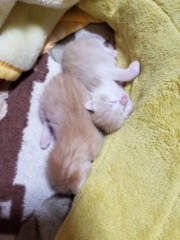 | 里親募集する理由 | 飼い猫が産んだのですが、産まれてきて生きていたのは2匹だけで他の子達は死産だったのですが、我が家で飼ってあげられたらいいのですが難しいので、誠に無責任ながら里親さまを募集させて頂くことになりました。 最近は目が開きました! お渡しは乳離れをして離乳食が食べられるようになってからのお渡しになると思います。 お渡しの際は出来る限りこちらから向かうようにはさせて頂きます。 場所はその都度ご相談の上決めさせて頂きたいと思います。 予防接種や避妊去勢手術はそちらで行って頂きたく思います。 何か気になる事などありましたら聞いてください。 |