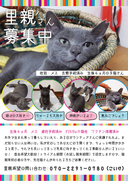 | 里親募集する理由 | TNR活動(ノラ猫に不妊手術を施して元の場所に戻す活動)をする中で、捕獲されましたがまだ子猫だったため、保護して里親さんを募集することにしました。 | ||