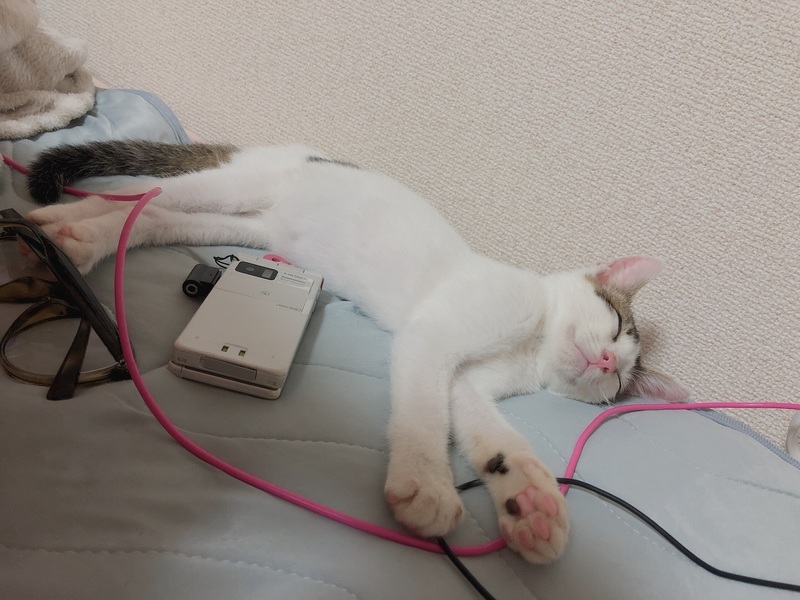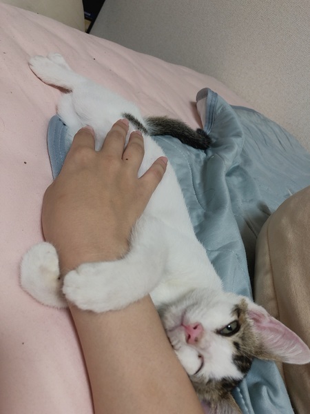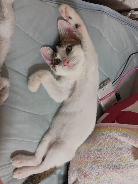 | 特徴(性格など) | とても甘えん坊のオス猫です。 けーたいを触っていたりして構ってあげないと必ず割り込んできて邪魔をします。寝る時も定位置は顔の目の前です。横を向いて寝ている時も首のところにぴったりひっついてきます。 |