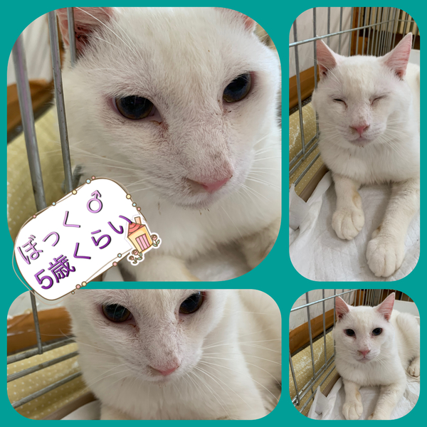 | 特徴(性格など) | 白の短毛で体格はおおきめで、がっちりとしているオス猫です。とても甘えっ子でカメラが大好きです。ご飯ももりもり食べてくれて元気いっぱいです。 | ||